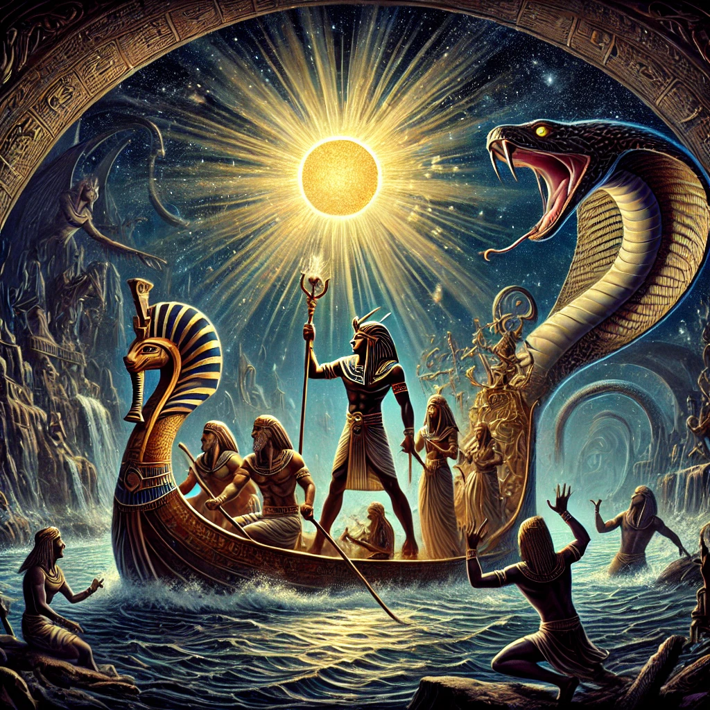 • 밤의 여정: 해가 진 후 라는 저승(두아트)을 여행하며 밤의 여정을 시작합니다. 이 여정은 위험과 혼돈이 가득한 길로, 라가 매일 밤 저승의 혼돈 속에서도 질서를 유지하기 위해 싸우는 과정을 묘사합니다.
