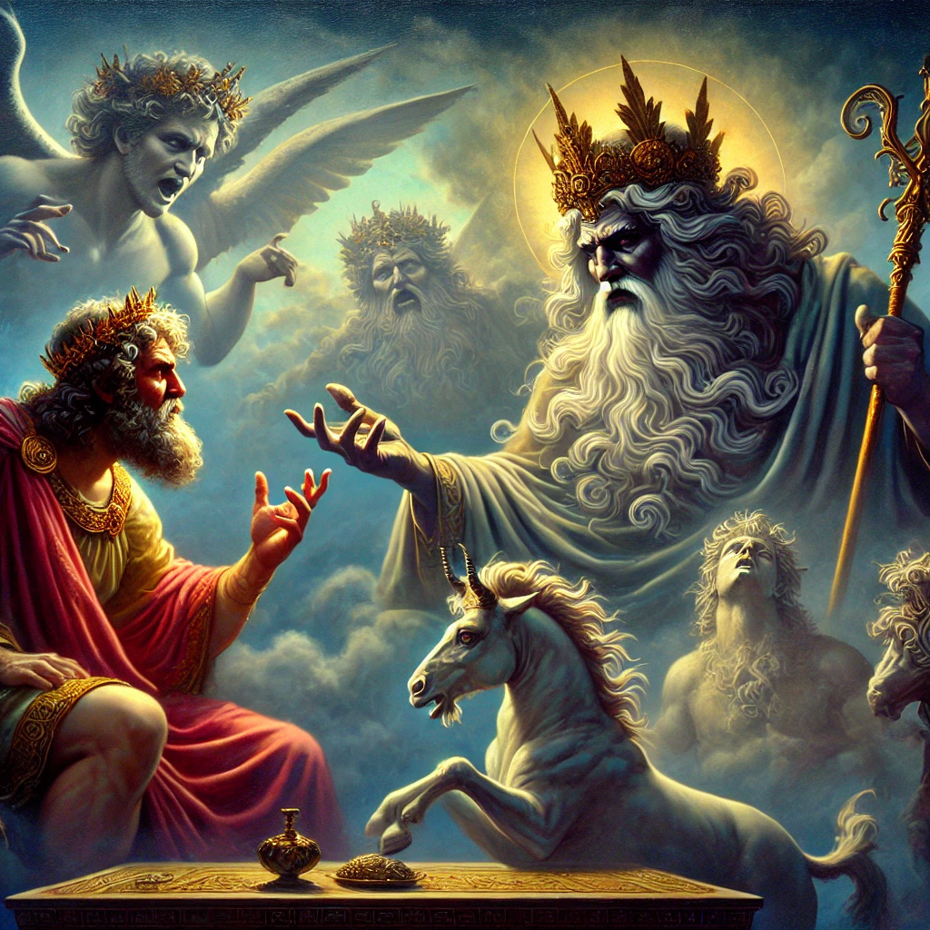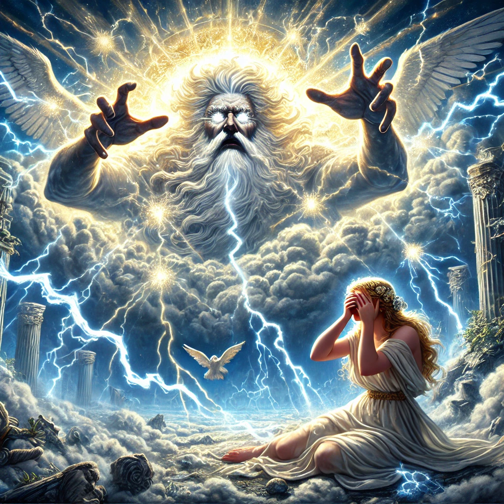 Zeus, unable to deny her request, revealed himself in his full divine glory. Blazing lightning and powerful radiance surrounded him. But no mortal could withstand the sight of a god in their true form—Semele was consumed by the divine flames.