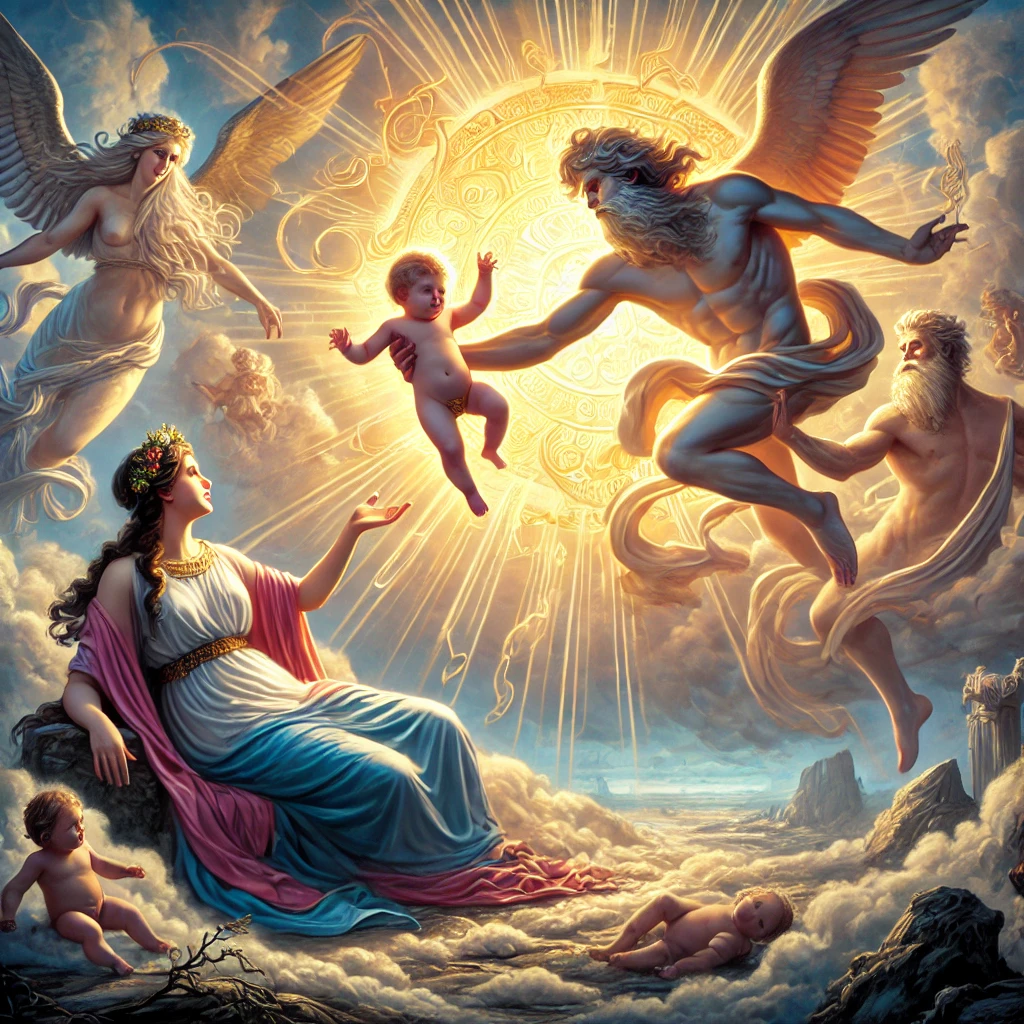 Yet, the unborn child miraculously survived. In desperation, Zeus took the baby and sewed him into his own thigh to keep him safe. After a few months, the child was born again, and he was named Dionysus.