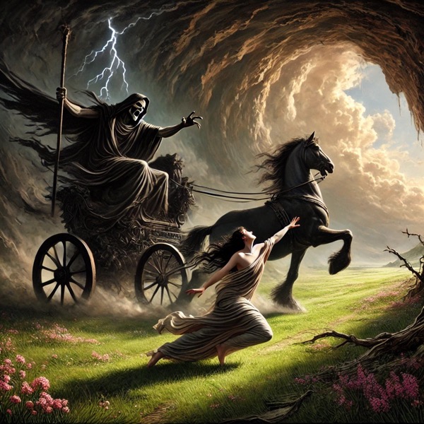 Hades abducting Persephone in his black chariot, dragging her into the underworld