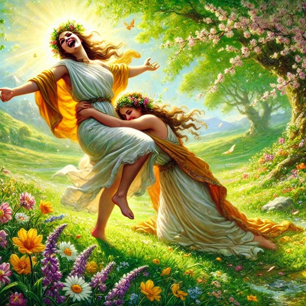 Persephone returning to the earth, bringing back the flowers and greenery, as Demeter embraces her in joy