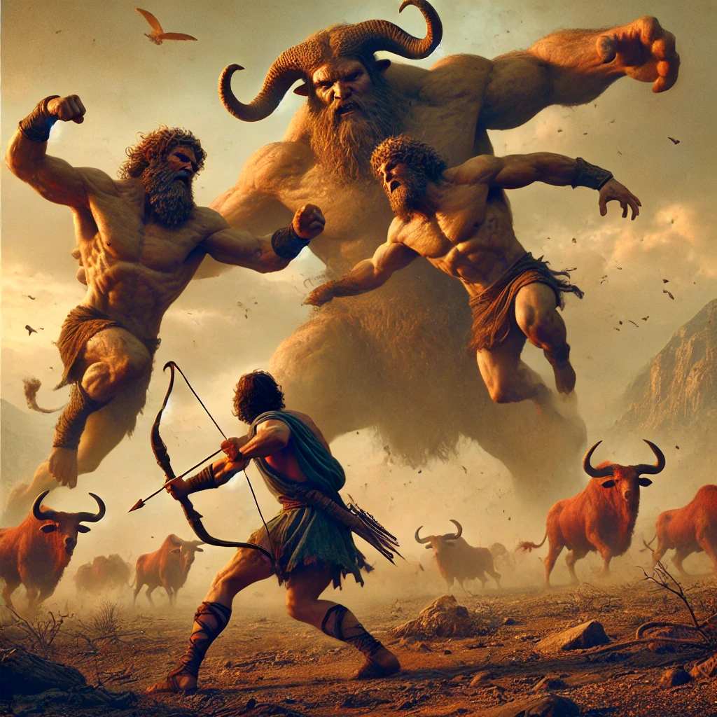 크레타에 도착한 헤라클레스는 황소가 마을을 파괴하는 모습을 목격했다. 그는 황소가 쉬는 순간을 노려 등 뒤에서 덮쳤고, 맨손으로 황소의 뿔을 붙잡아 힘으로 억눌렀다. 거대한 황소는 거칠게 저항했지만, 헤라클레스의 힘을 이길 수 없었다. 결국 황소는 길들여졌고, 헤라클레스는 그것을 미케네로 끌고 갔다.