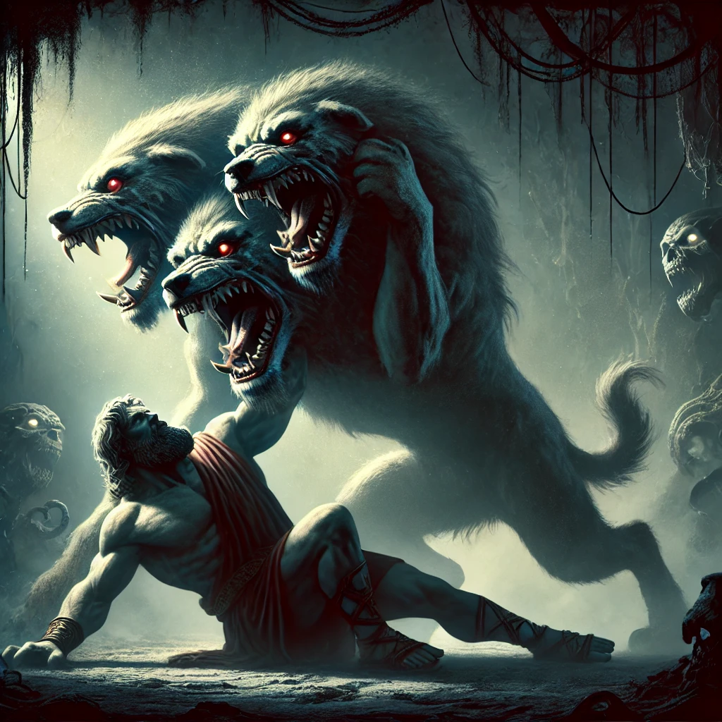 헤라클레스는 지하세계로 내려가 하데스와 페르세포네를 만났다. 하데스는 그가 케르베로스를 원한다면 무기를 사용하지 않고 힘으로 제압해야 한다고 했다.