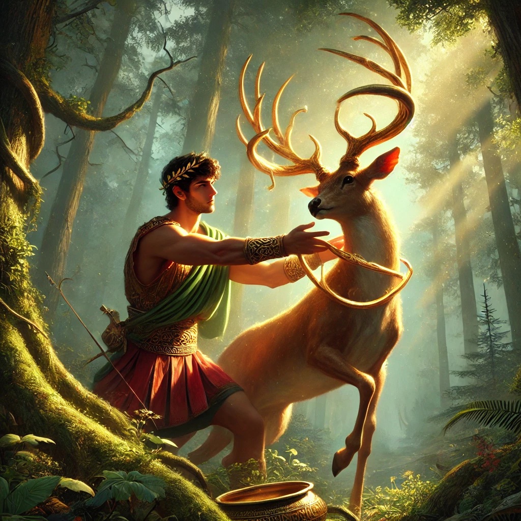 Heracles pursued the deer for an entire year, patiently tracking and exhausting it. When the animal finally collapsed from fatigue, he gently captured it. However, on his way to present the deer to King Eurystheus, Artemis appeared and demanded its release.