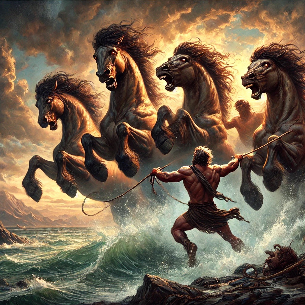 Heracles and his men stole the horses under the cover of night, but Diomedes pursued them with his soldiers. In the ensuing battle, Heracles killed Diomedes and fed his body to the horses. Satiated, the horses became tame, allowing Heracles to lead them to Mycenae.