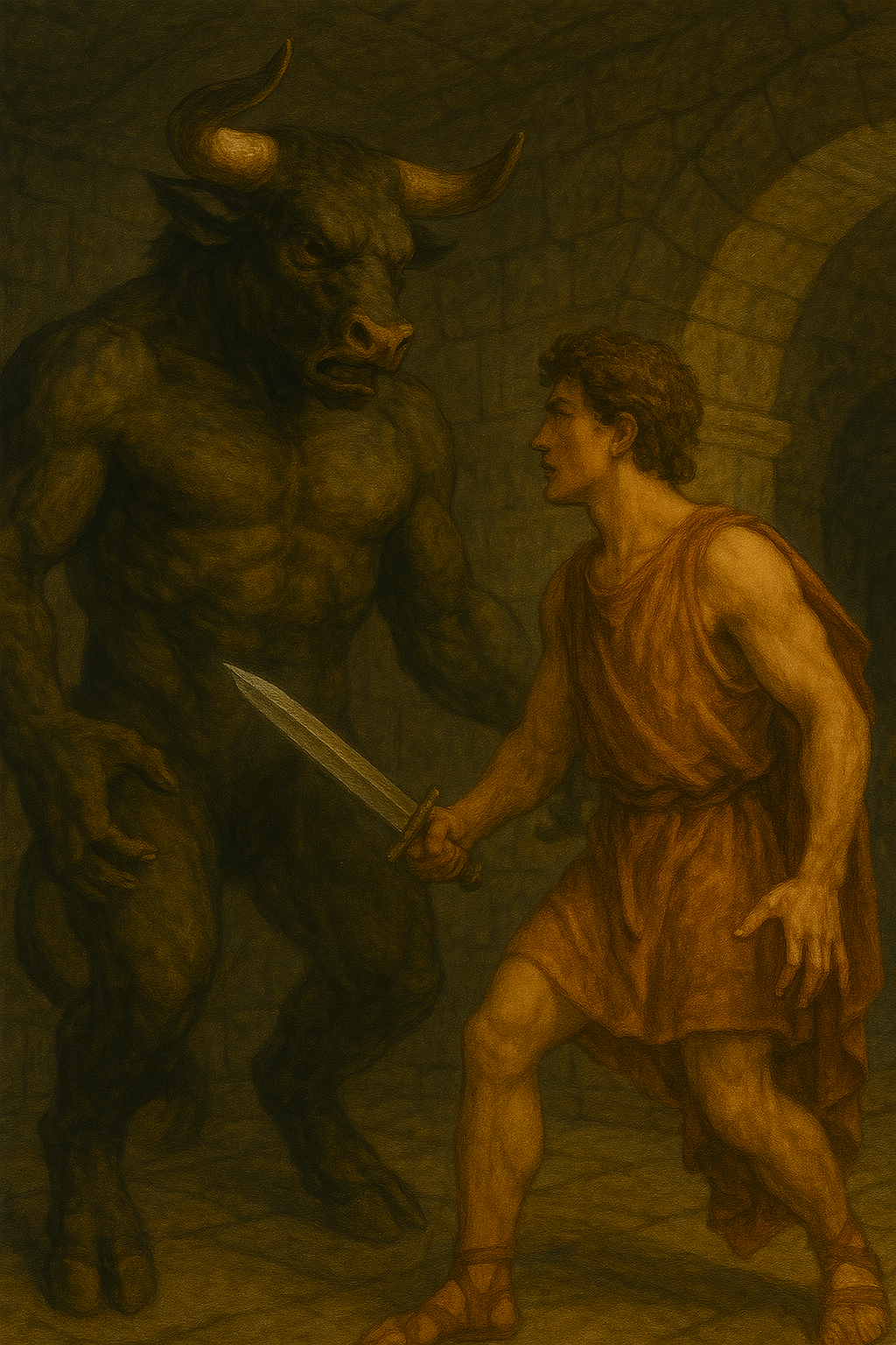 미궁은 고요했지만, 테세우스는 점점 거대한 숨소리를 느끼기 시작했다. 벽은 차갑고 축축했으며, 발걸음마다 메아리가 깊이 퍼졌다.