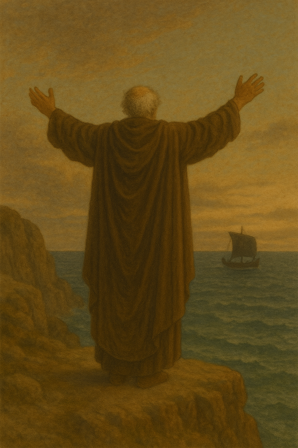 아이게우스 왕은 절벽에서 망망대해를 바라보다, 검은 돛을 보고 충격에 휩싸인다.