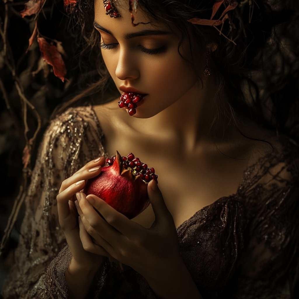 한편, 저승에서 하데스는 페르세포네를 왕비로 삼으려 했습니다. 페르세포네는 처음에는 저항했으나, 시간이 지나면서 하데스와 함께 저승의 통치자로서의 운명을 받아들이게 되었습니다. 하데스는 페르세포네에게 저승의 음식을 권했는데, 이는 중요한 전개를 가져오게 됩니다. 페르세포네는 하데스가 준 석류 씨앗 몇 개를 먹게 되었고, 이는 그녀가 저승에 영원히 속하게 되는 상징적인 행위였습니다.