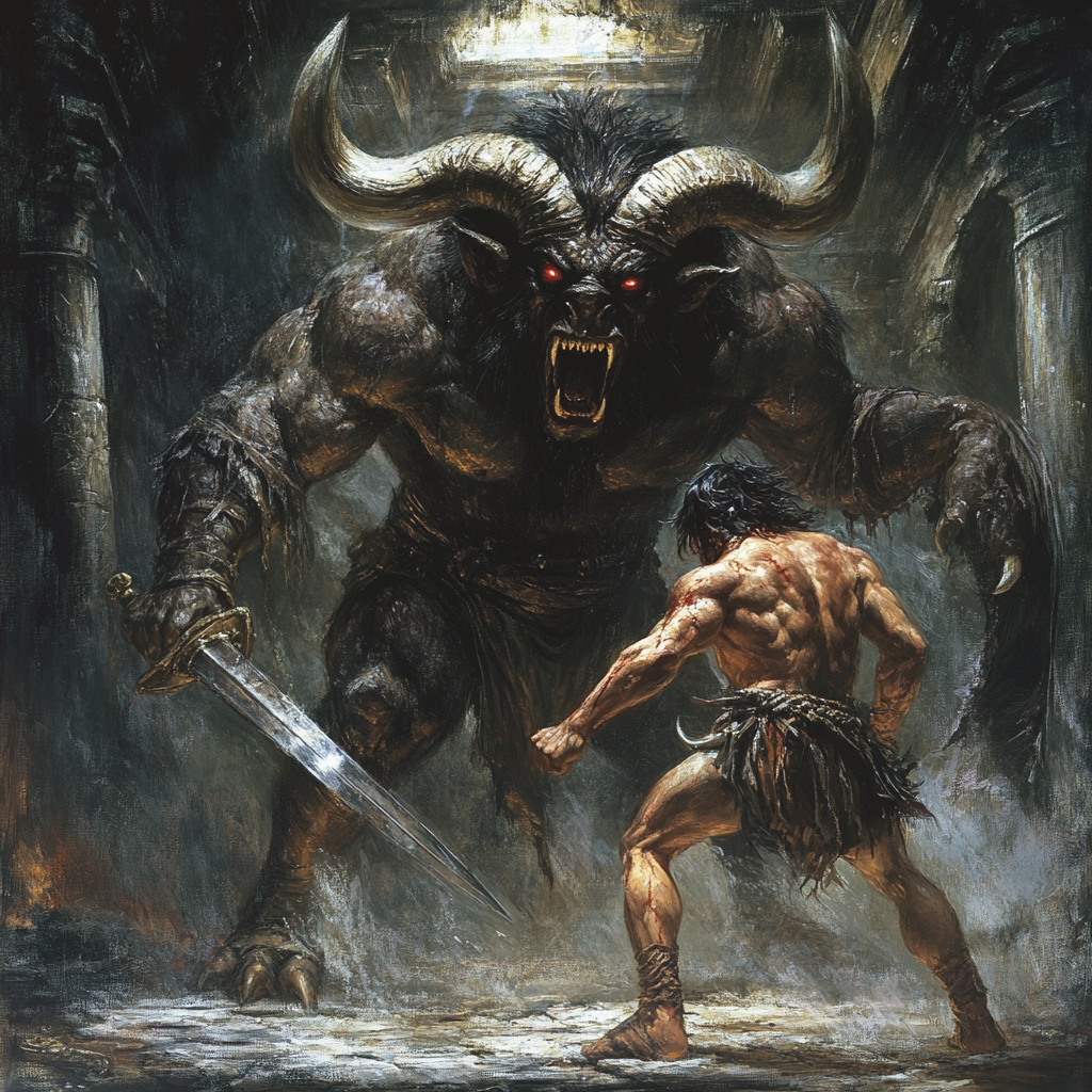 테세우스와 미노타우로스의 결투 : by Midjourney