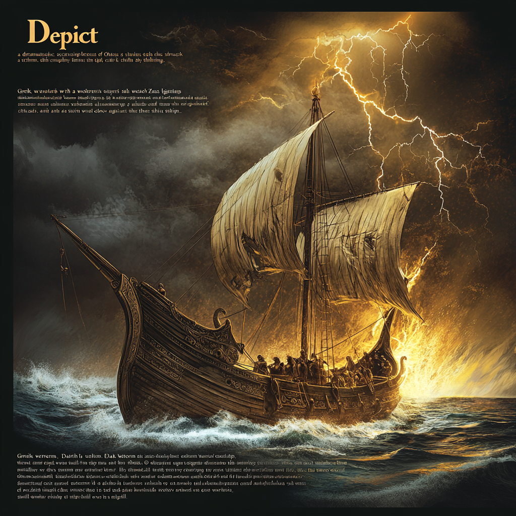 제우스의 번개를 맞는 오디세우스의 배 : by Midjourney